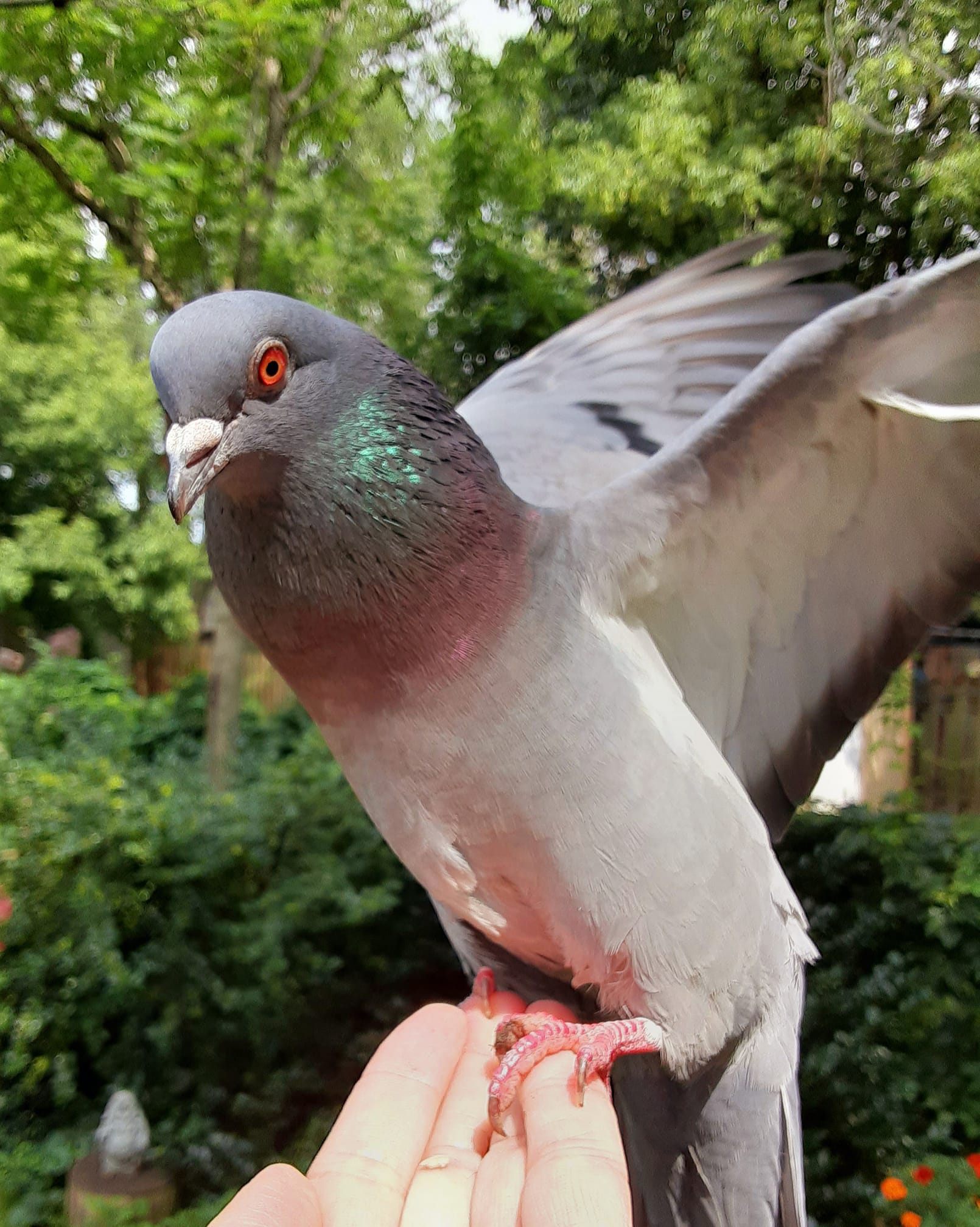 My thoughts on these birds changed (and my heart opened up) back in July 2012 when a pigeon flew into our backyard and literally jumped into our laps while Angie and I sat on the back deck having morning coffee. He visited almost daily for over 5 years, often just hanging out in the yard with us. I think it was during his second year that he started bringing in a lady friend and they were pretty much inseparable. I assume someone habituated this bird early on in his life to make him so friendly with people but for whatever reason he found, or rather chose us, and spent much of his life here, during the day anyway.